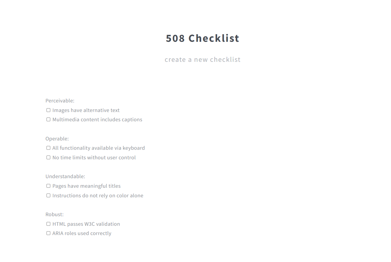 front-end tool that allows users (e.g., internal staff or accessibility auditors) to go through a list of Section 508 compliance items, check off those that have been completed, view tooltips with explanations or examples, and export their checklist for documentation or auditing purposes.